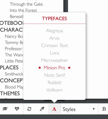 - Custom Typefaces: Users with Shaxpir 4: Pro subscriptions can now choose from among nine different custom typefaces to use for their writing, separately from choosing their own custom themes. Previously, each typeface was only available within a specific theme, but now the themes and typefaces can be selected independently of each other.