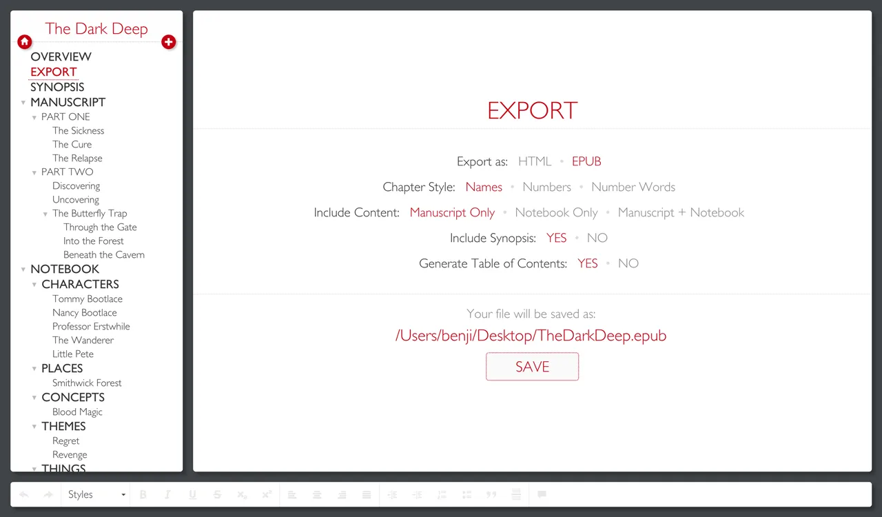 To generate an EPUB for one of your story projects, just go to the EXPORT panel, and choose EPUB as your export format. Then configure the other export options (e.g., whether to include your notebook or manuscript, whether to generate a table-of-contents, etc), and click on the SAVE button.