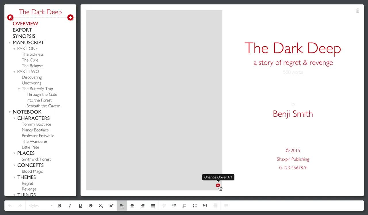 Shaxpir now supports adding cover art to your story projects, and it embeds that cover art within your exported EPUB file. Just go to the story OVERVIEW panel, and click on the camera icon to select a cover image from your hard drive. Most ebook retailers have guidelines (footnote: 2) for the dimensions and format of your cover image, so be sure to double-check that your cover art conforms with those expectation.