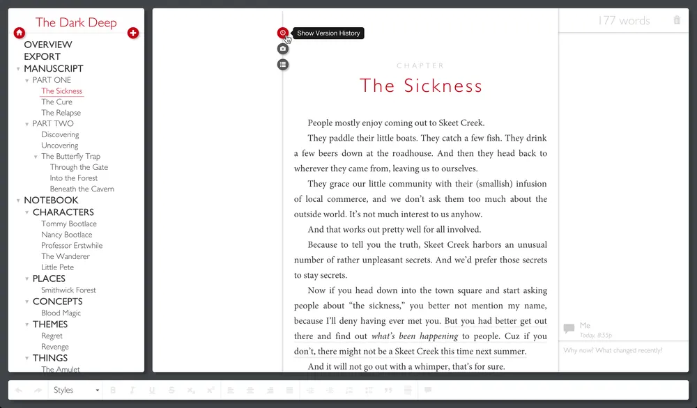 To view the version history of any chapter or note, just click on the Show Version History button: