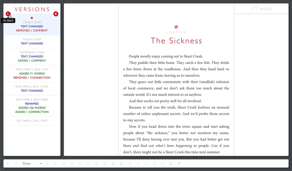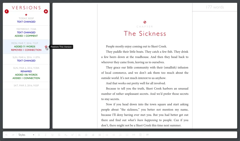 The left-hand navigation panel will slide away, revealing a complete history of version snapshots. You can scroll through this list to see the timestamps and a summary of changes made during each writing session. Click on any of these summaries to see the complete body of that snapshot, including the full text, concept artwork, connections, and margin comments. You can’t edit these snapshots, but you can click on the Restore This Version button (with the star icon) for any snapshot in the list.