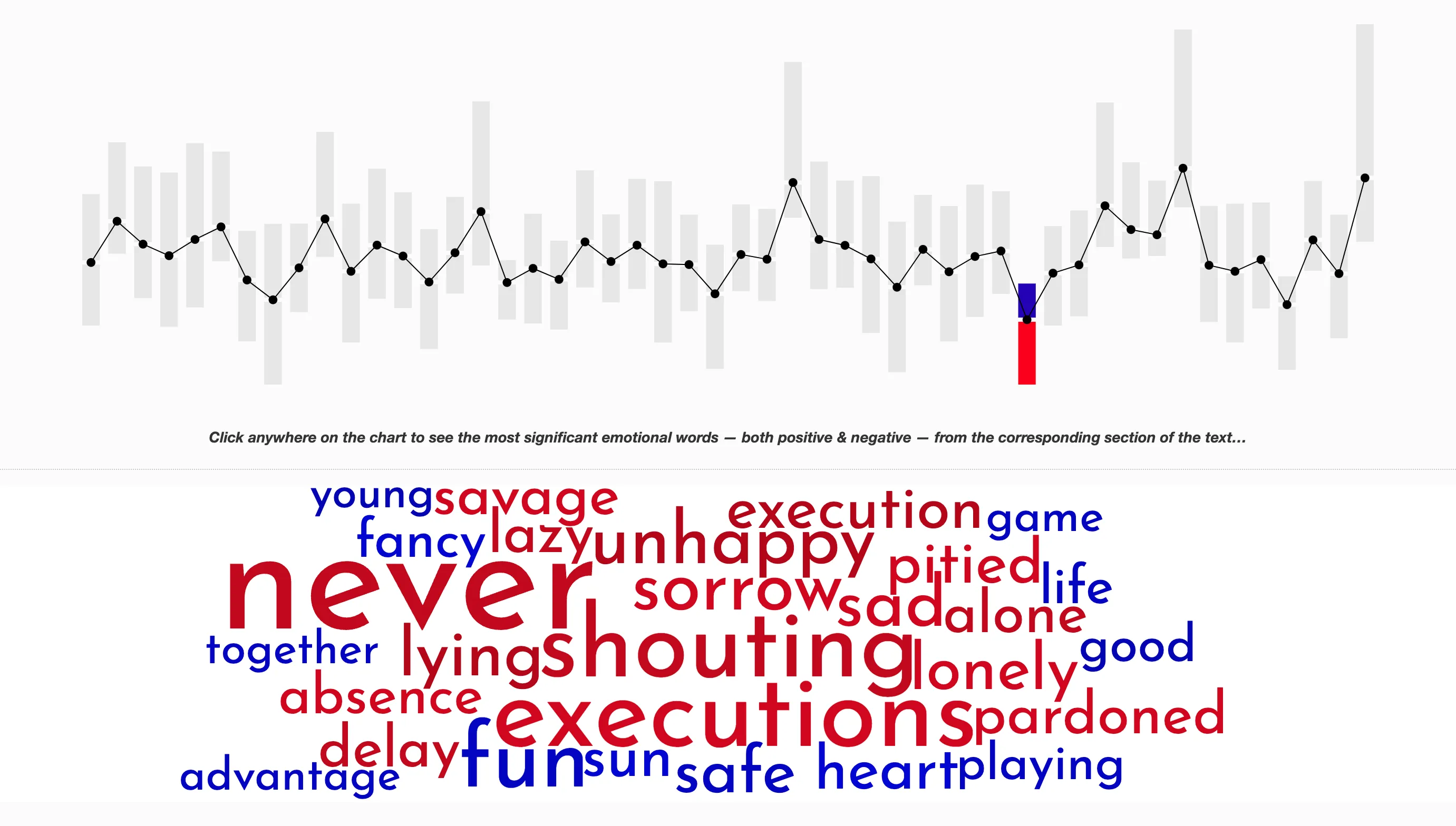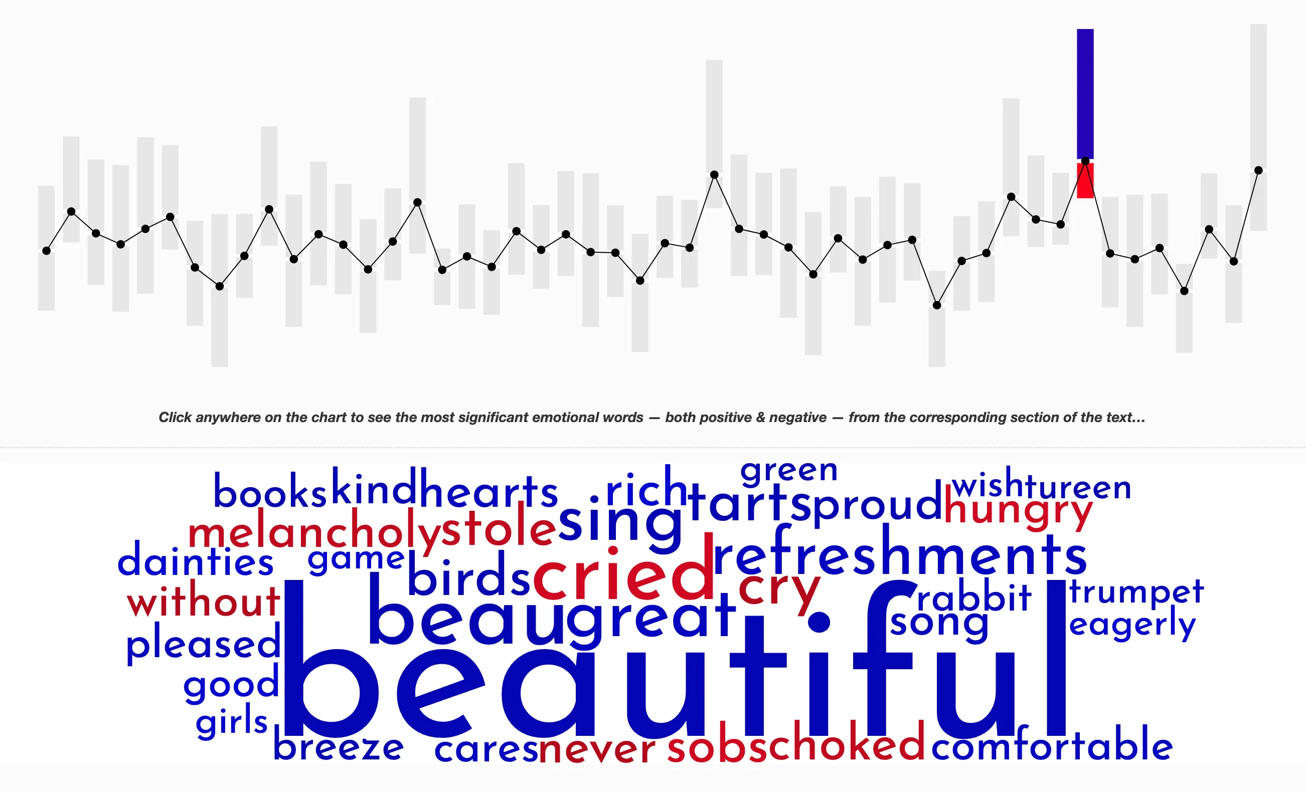 The sentiment analysis of each book showed the low-point and the high-point of the story, with word-clouds showing how the specific language on the page contributes to the emotional story arc of the characters. Here’s what that analysis looks like for Alice’s Adventures in Wonderland: