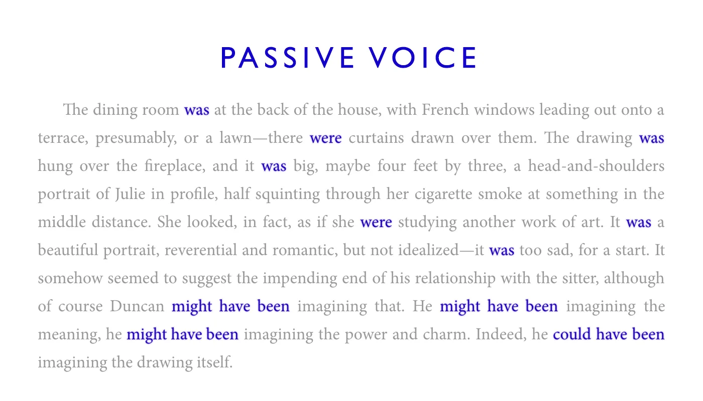 All four of these constructions use auxiliary verbs to impose a layer of indirection between the reader and the true action of the story. And when you stack helping verbs into sequences (“Jane might have been in the Navy”), it just intensifies the degree of detachment. In this example, a construction like “might have been” doesn’t just describe a state-of-being. It actually describes a speculative state-of-being, which is two steps removed from the real action of the story. That’s why we count each and every auxiliary verb, and use those total counts to determine the sum-total of passive voice in a body of text.