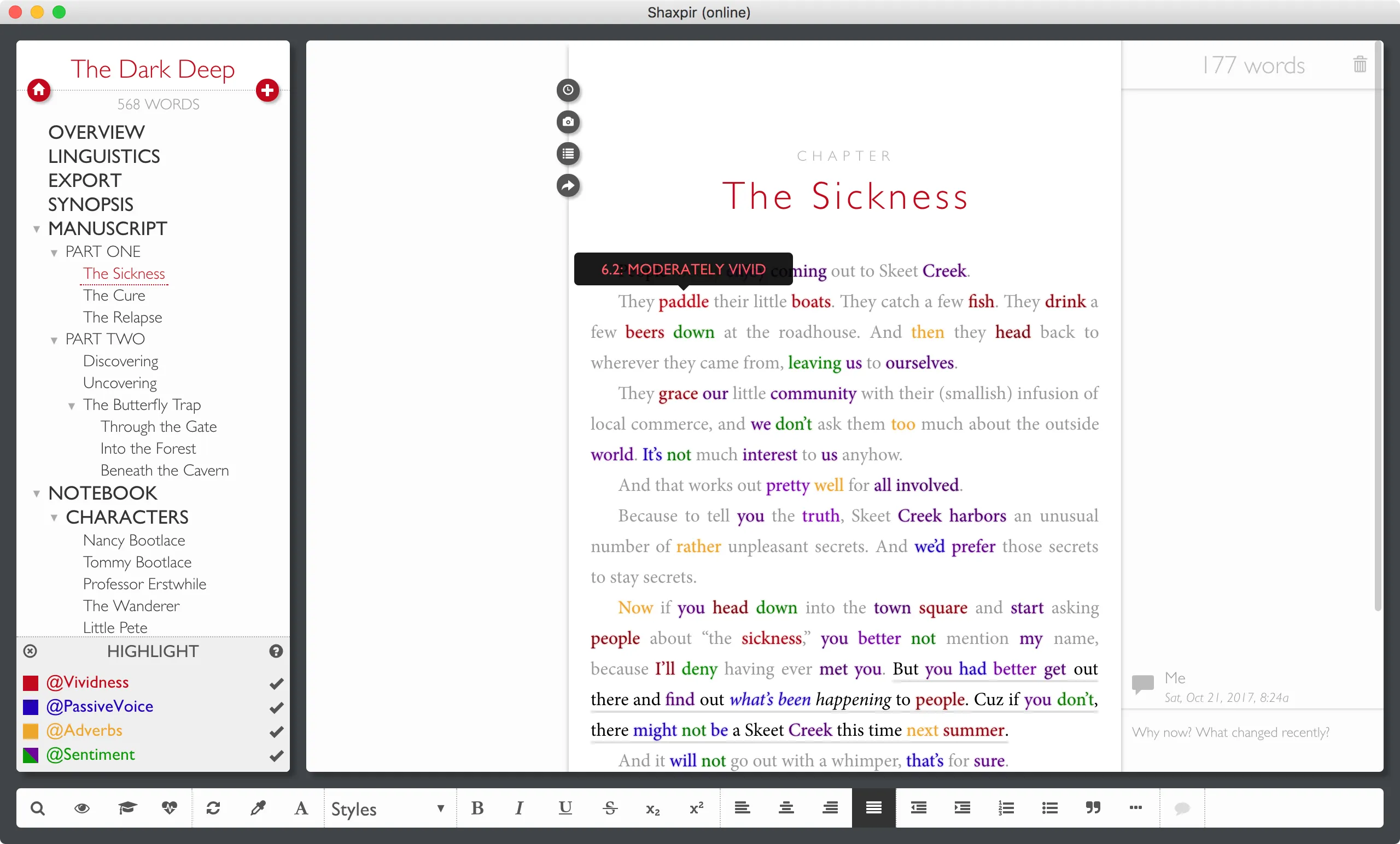 You can use our linguistic highlighting engine to show you exactly which words make your writing the most vivid, and you can use the linguistics panel to show you a high-level summary of your language metrics, telling you how your writing stacks up, compared with the rankings of the books in the Prosecraft library.