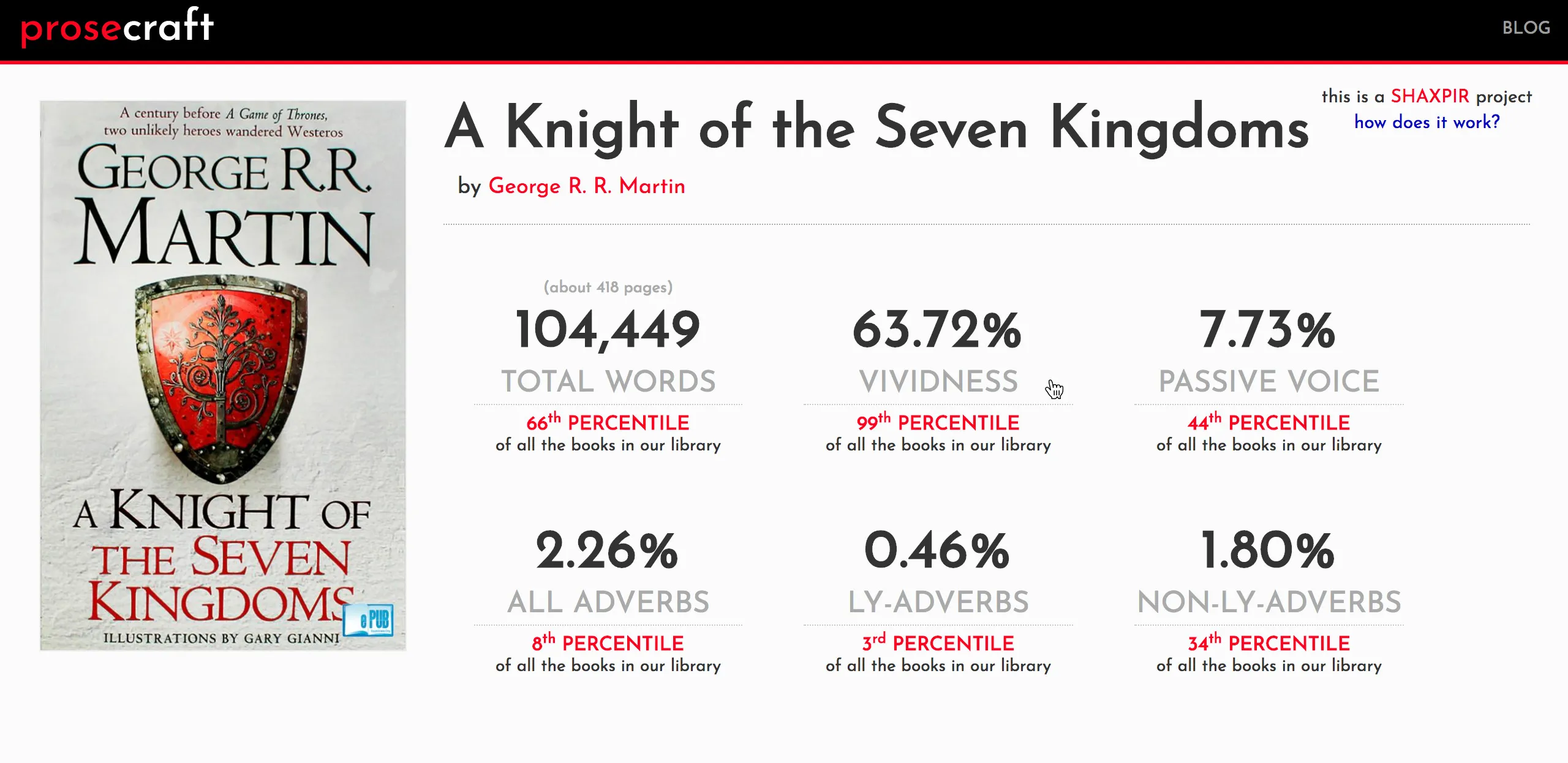 One of the most vivid books in our library, in the first row of our 99th percentile results, is A Knight of the Seven Kingdoms, by George R. R. Martin. If you click on its link, you’ll see a high-level linguistic summary, which includes the average vividness score for this novel: