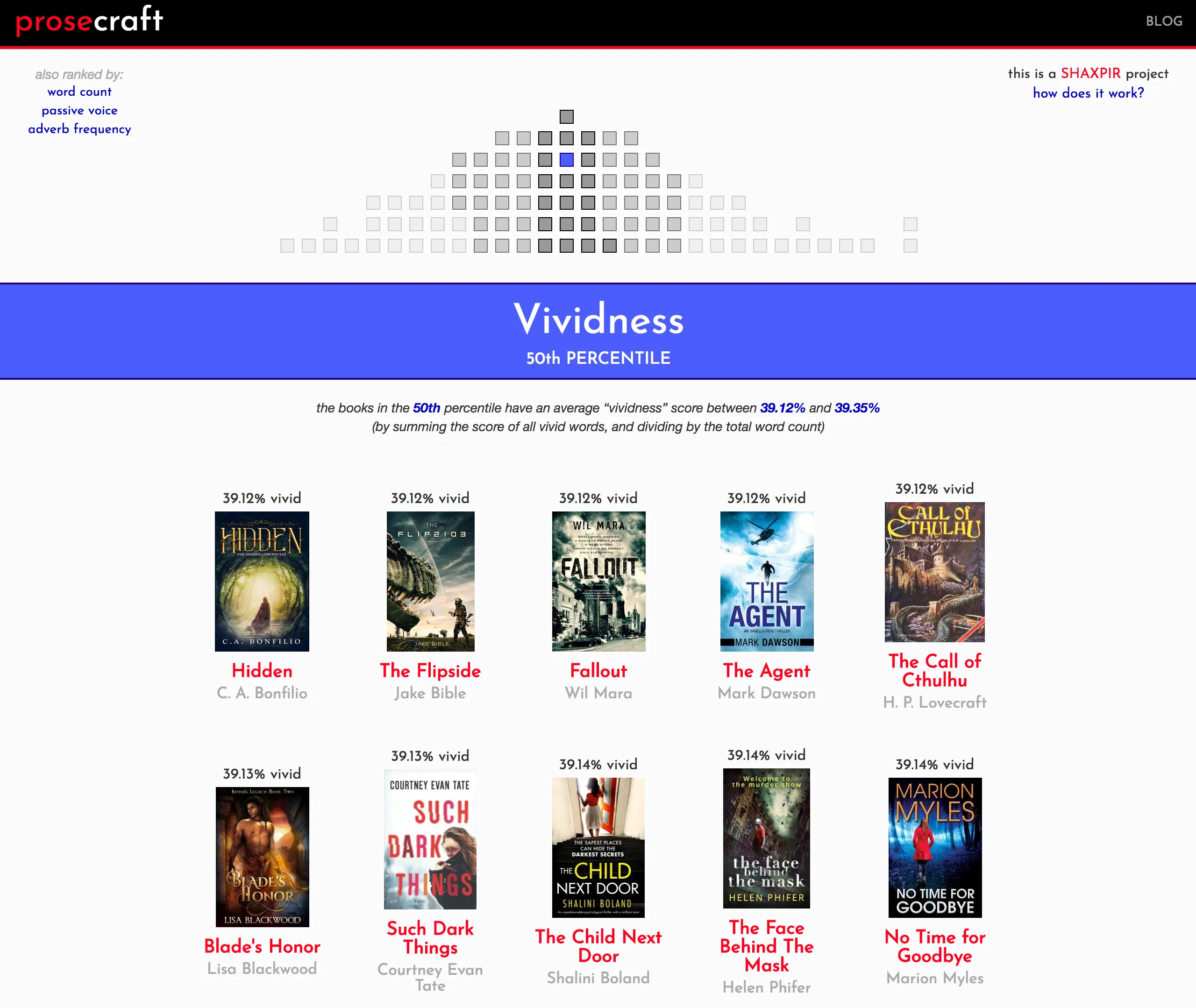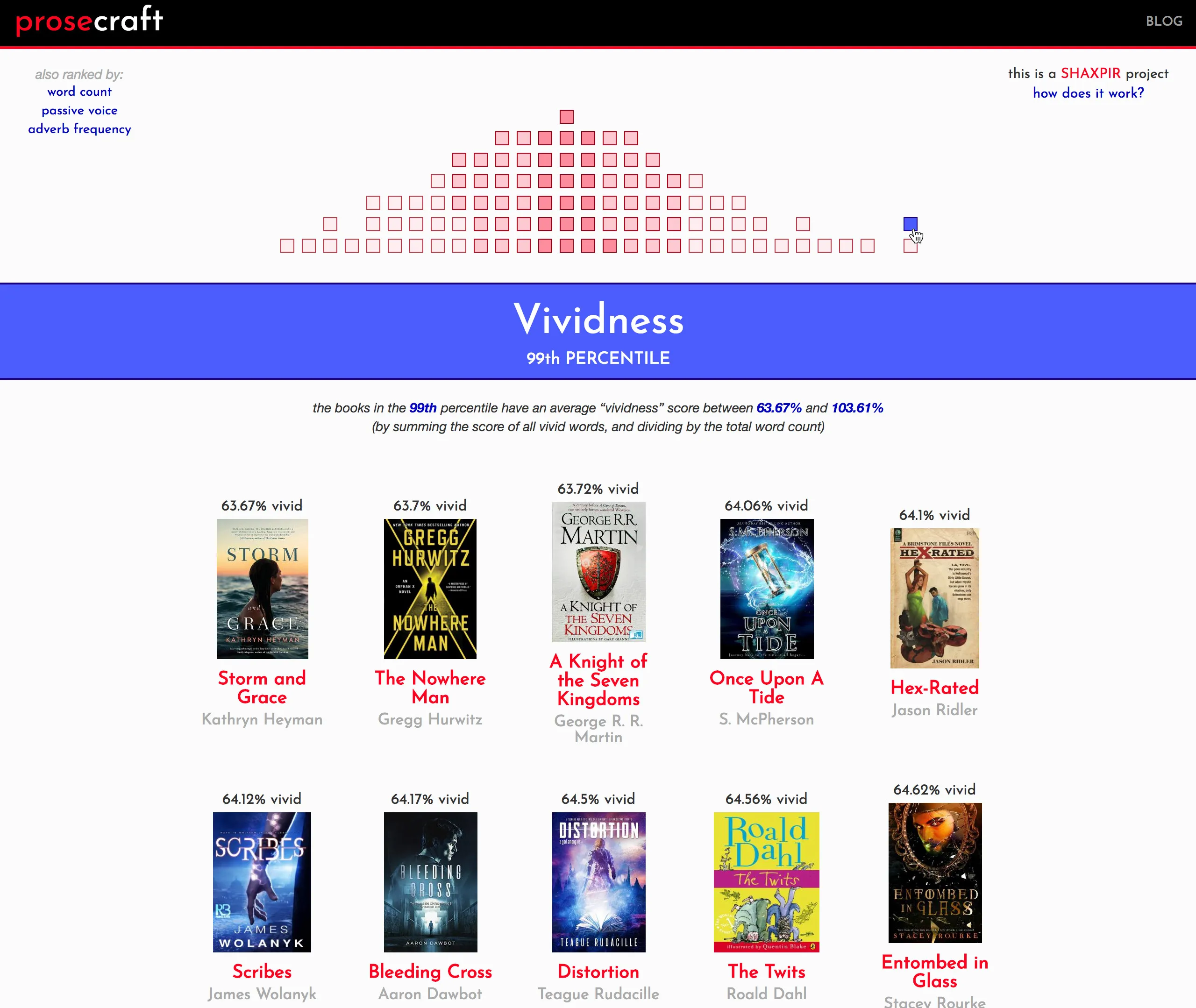 Finally, we rank every book in the library by its average vividness score, and then published the rankings on the free public Prosecraft.io website, here: