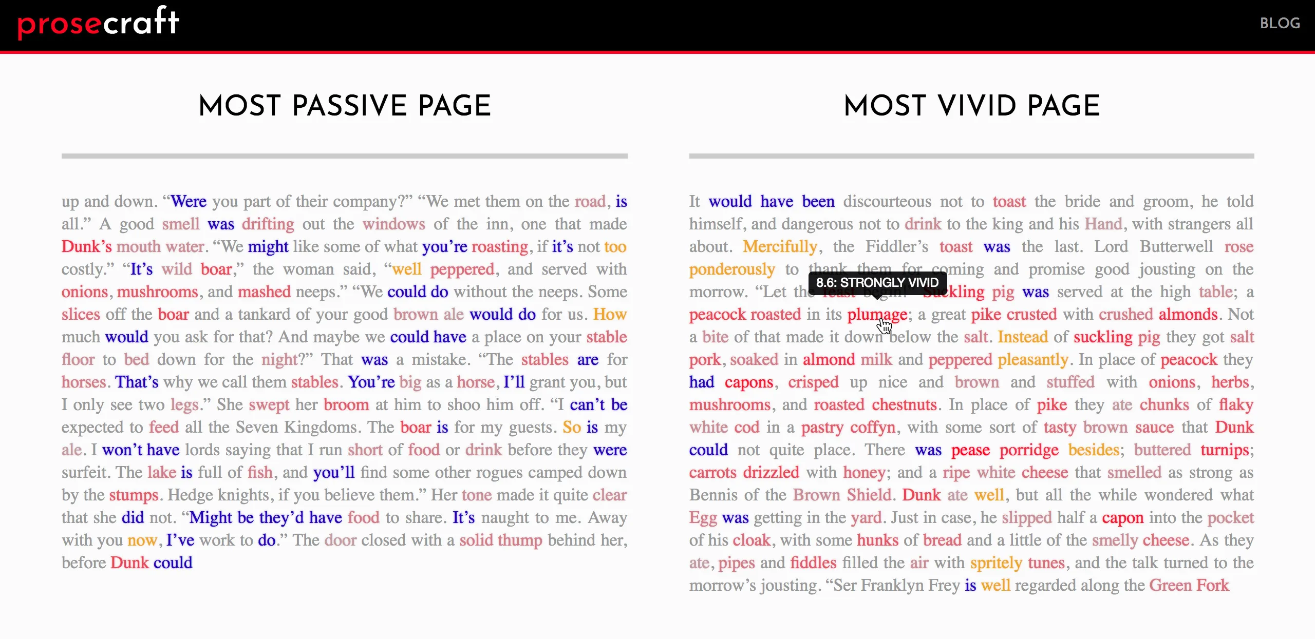 But if you scroll down a little bit, you’ll also see a set of text-clippings, which include the page of the book with the highest intensity of vivid words (as well as the greatest density of passive voice usage). Vivid words are highlighted in shades of red (while passive voice is highlighted in blue, and adverbs are highlighted in yellow):