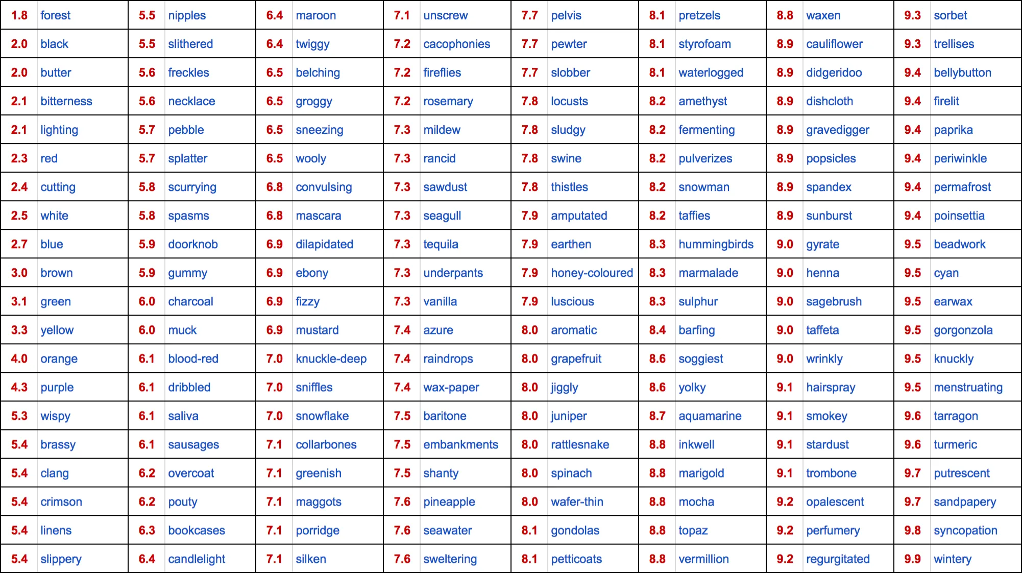 Typical color-words (like “black” or “red” or “blue”) have lower intensity scores, while more unusual color-words (like “honey-colored” or “periwinkle” or “cyan”) have higher intensity scores. You’ll also see scores for food items, body parts, natural phenomena, household goods, architectural features, etc, etc, etc. Basically, any word that tickles your senses…