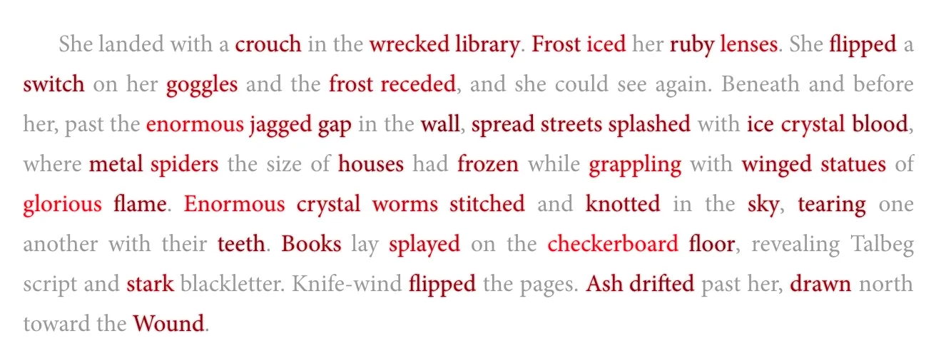 For example, here’s a paragraph from of Max Gladstone’s latest novel, Ruin of Angels, with all the most vivid words highlighted: