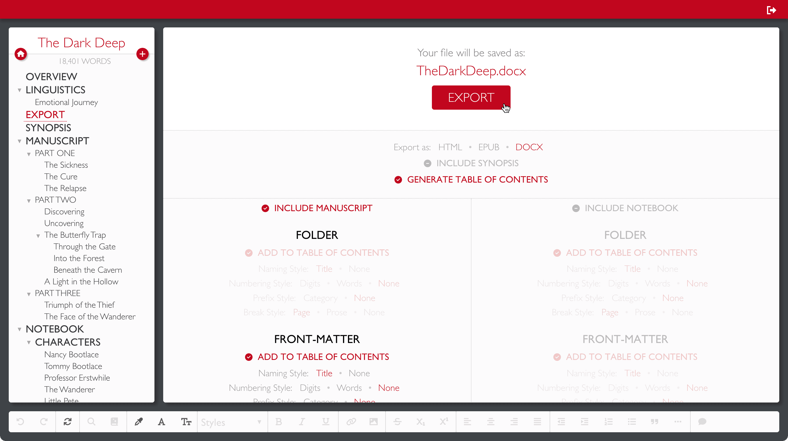 When you're ready to submit your manuscript to a publisher, or publish it yourself on the web, Shaxpir Free allows you to export your works for industry-standard Microsoft Word files (DOCX) or HTML.