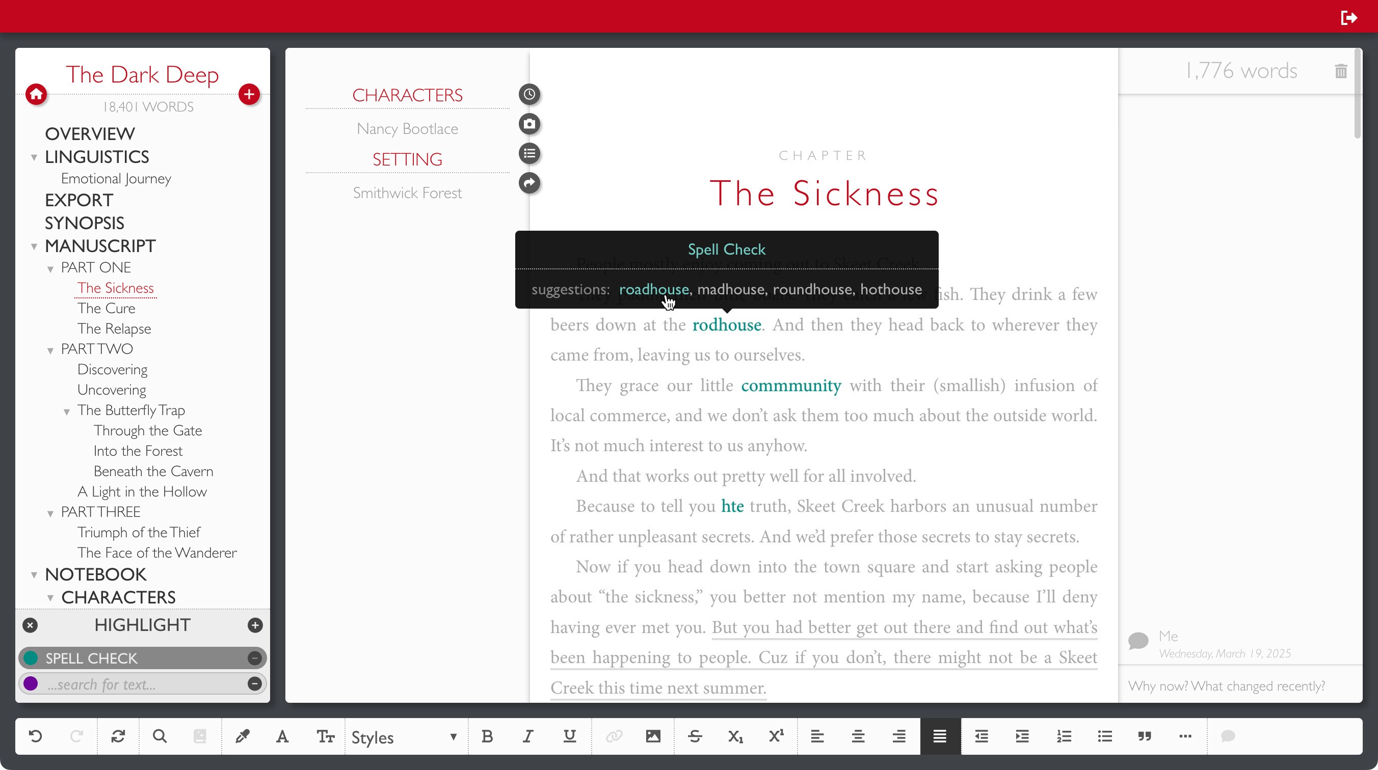 Shaxpir’s Spell Check feature operates as a Basic Highlighter, marking misspelled words with vivid, eye-catching highlights. Clicking on a highlighted error brings up a list of suggested corrections, allowing you to replace the misspelling with a single click. Tailored specifically for narrative prose and storytelling, Shaxpir’s spellcheck dictionary ensures reliable and relevant support for your writing.