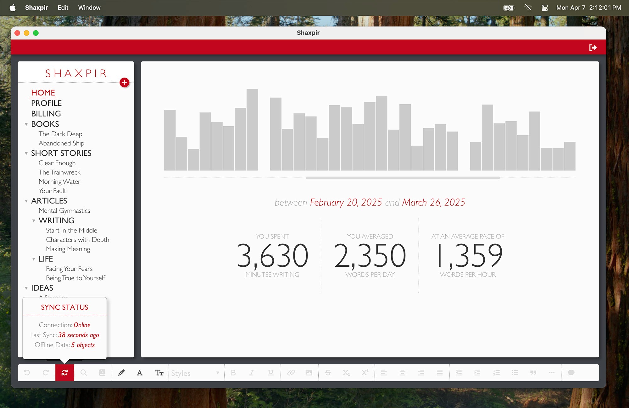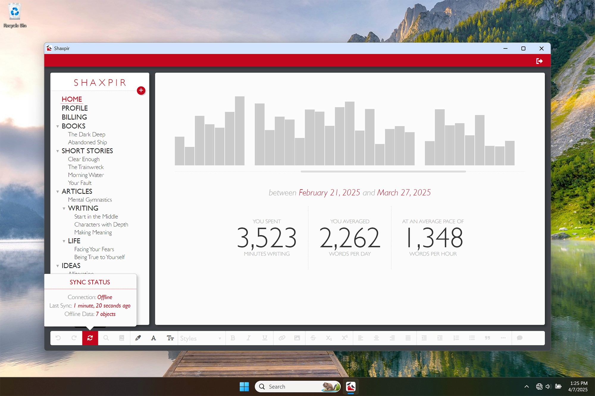 But sometimes the internet can be a huge distraction, and you need to cut the cord to get real work done. Users of Shaxpir Pro can download our exclusive desktop application for Windows or Macintosh, so you can always unplug from the matrix and spend a week writing from a cabin in the woods.