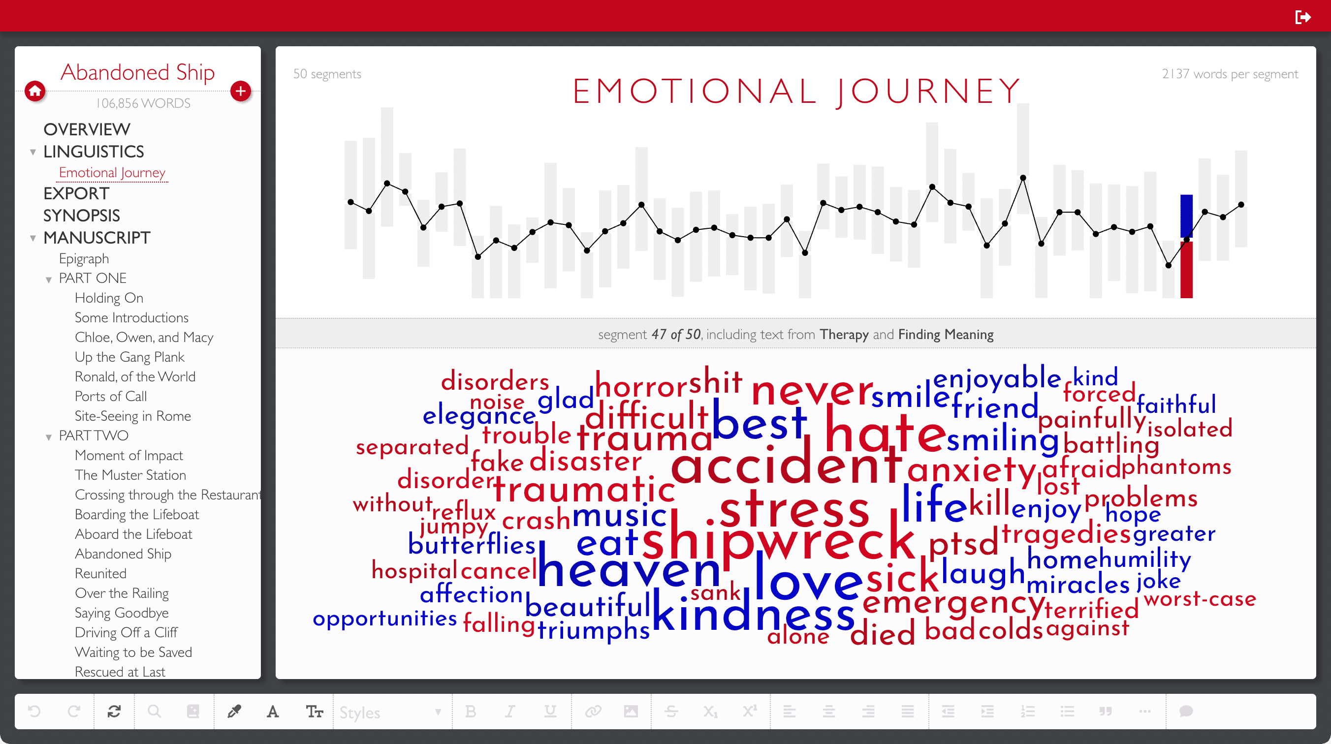 By tallying up all those individual linguistic choices on every page of your manuscript, we can show you the Emotional Story Arc of your entire narrative, and you can drill down into each section of your book to see the word-choices that lead to those ups and downs.