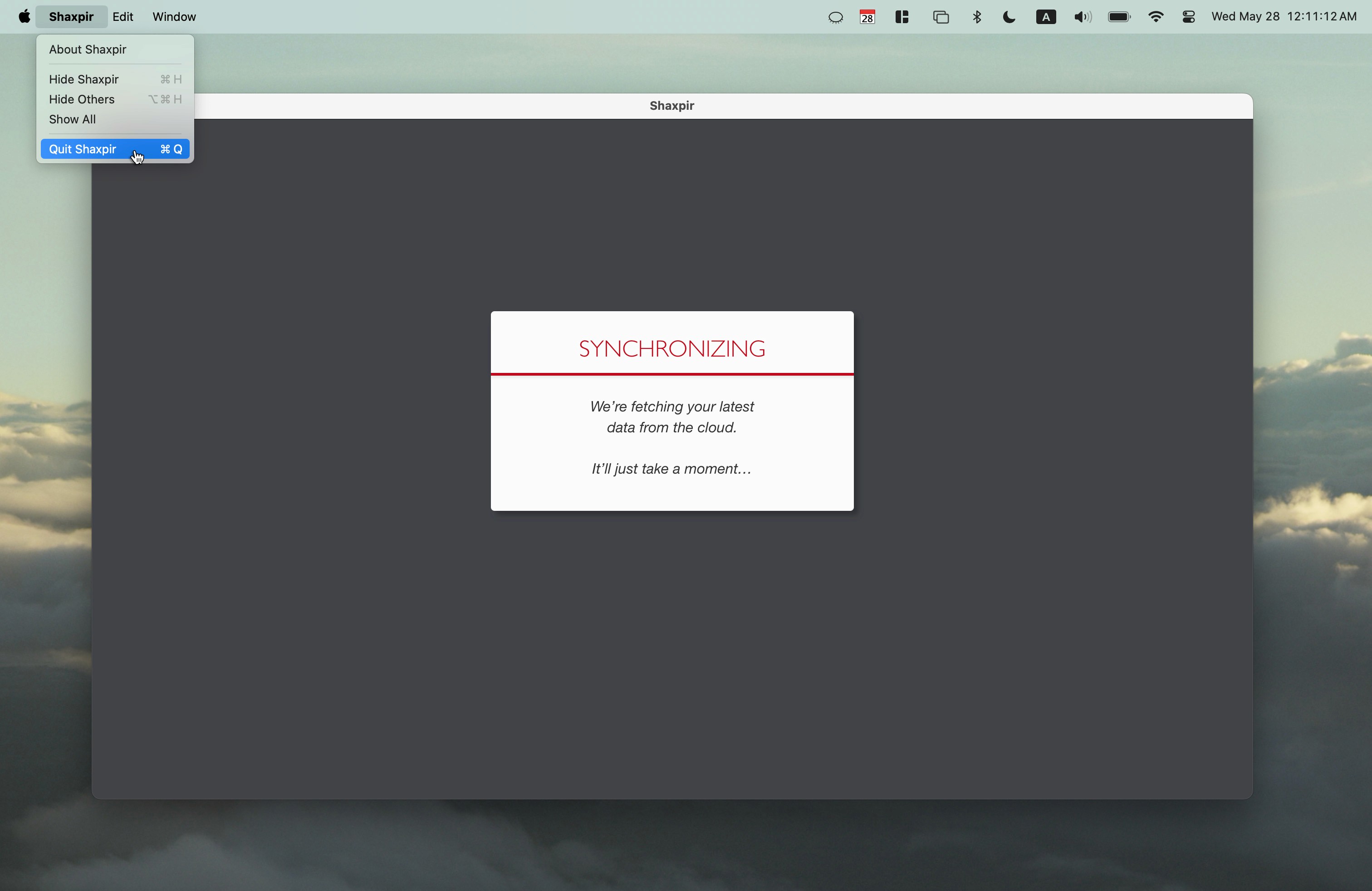 Occasionally, after logging into Shaxpir on the Desktop app, the screen might get stuck in the "Synchronizing" state, like this: