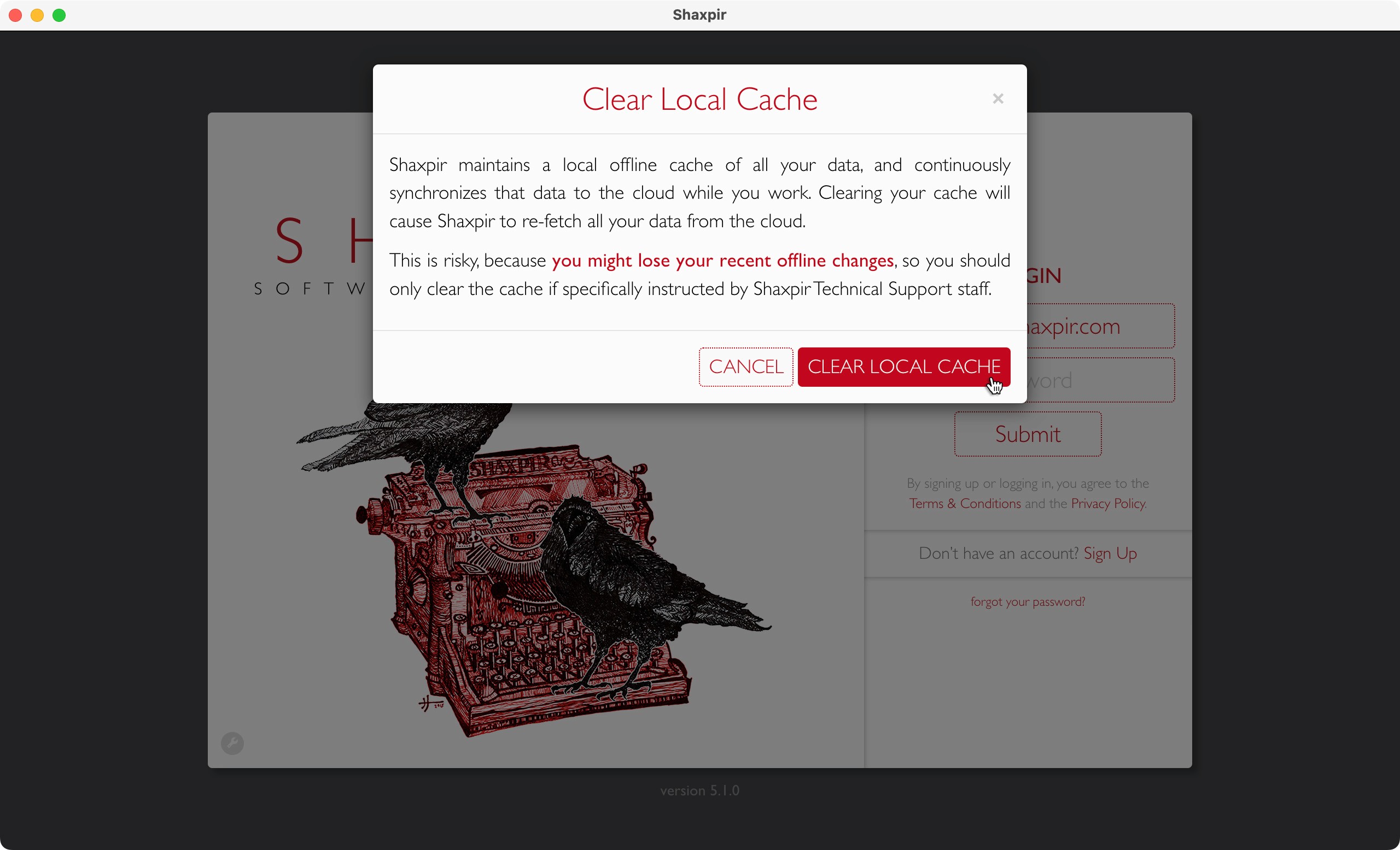 This window includes a warning that recent offline data might not have synced to the cloud yet. When you click the "Clear Local Cache" button, the application will first zip up all your local cache data and upload it to the cloud (in the background) so that we can recover, in the rare case of data loss. Once your local cache has been safely uploaded to the cloud, the application will clear your local cache and return you to the login screen.