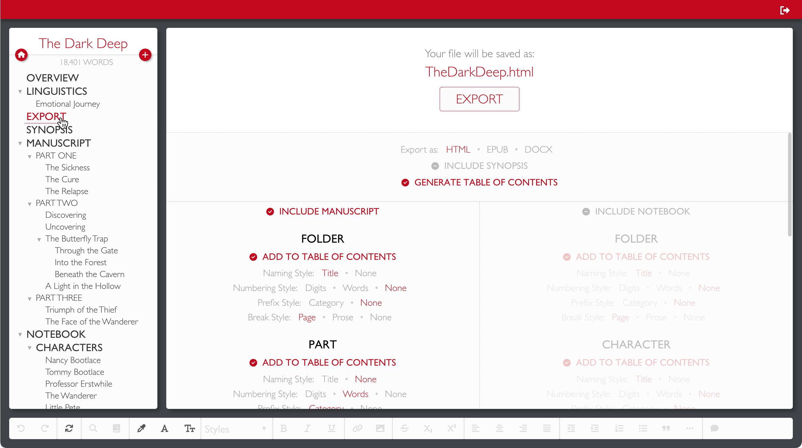 - Include Manuscript - Export your book's chapters, parts, and scenes