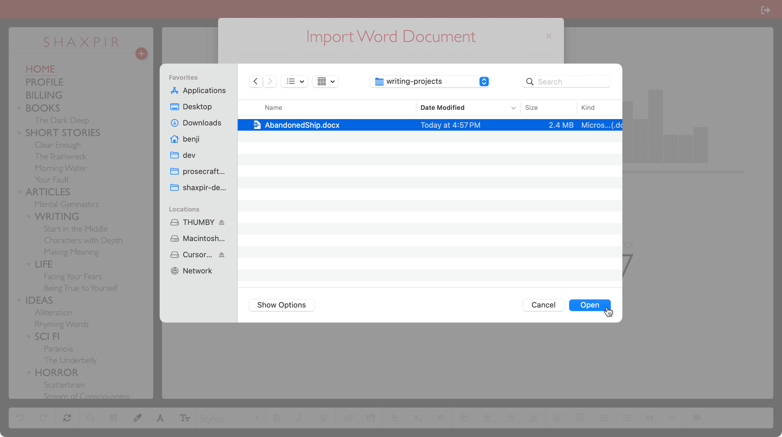 You can perform an import in the Shaxpir browser app, or in the desktop app. Users of the desktop app can perform DOCX import anytime, either online or offline.