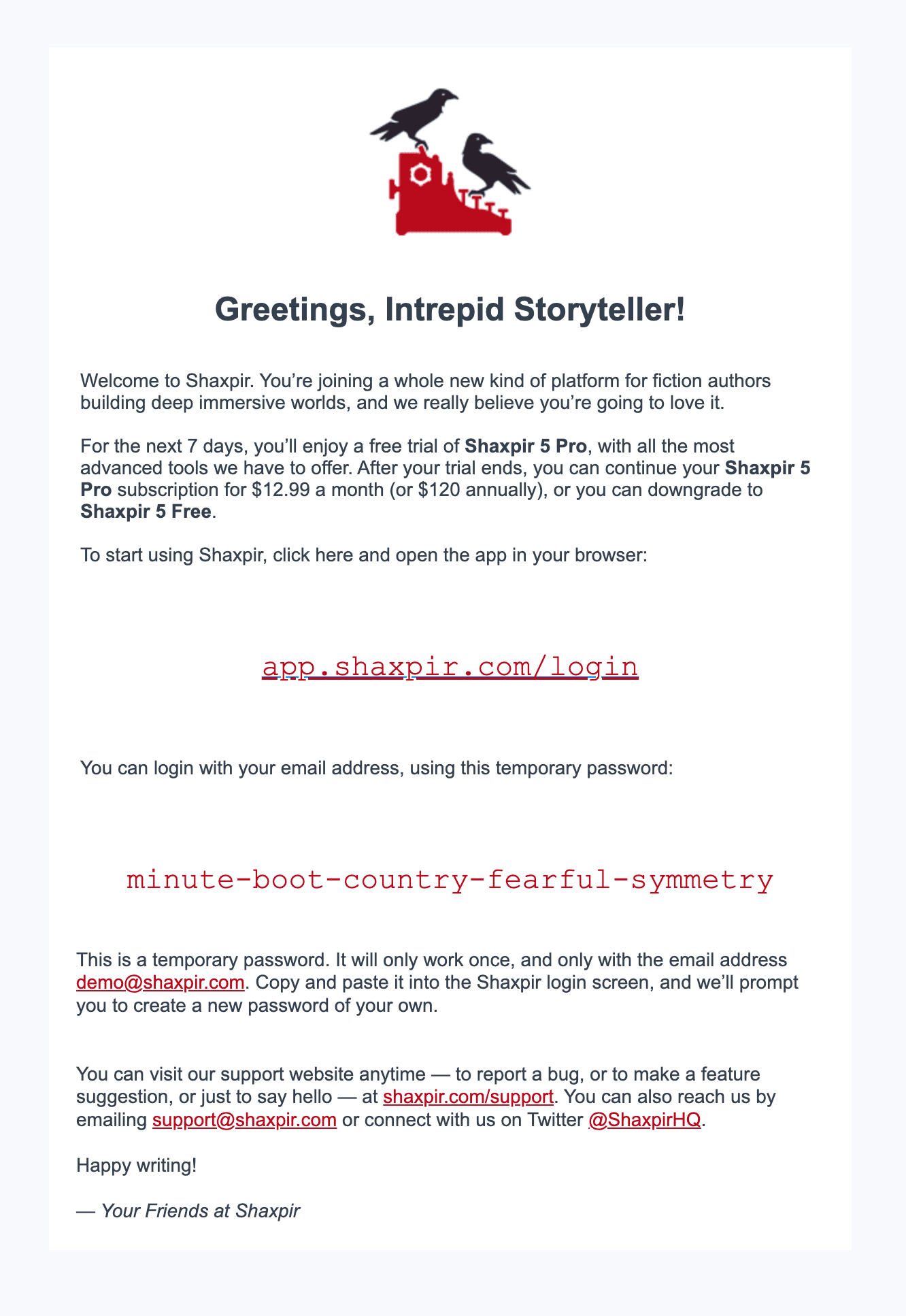 Click the link, which will take you to the Shaxpir login page, at https://app.shaxpir.com/login. On that page, you’ll enter the password we sent you.