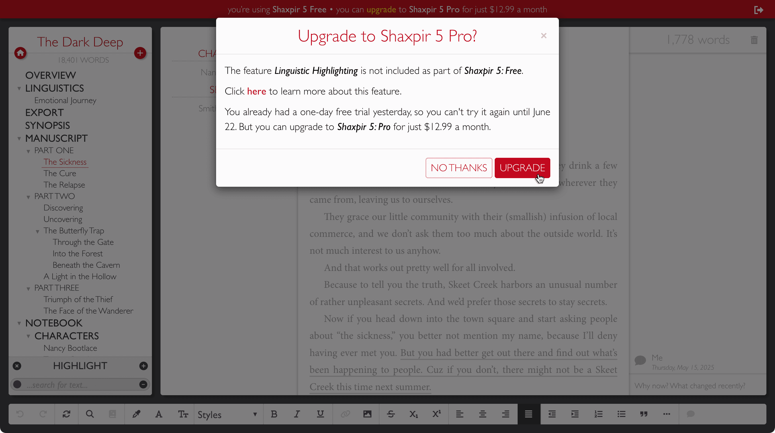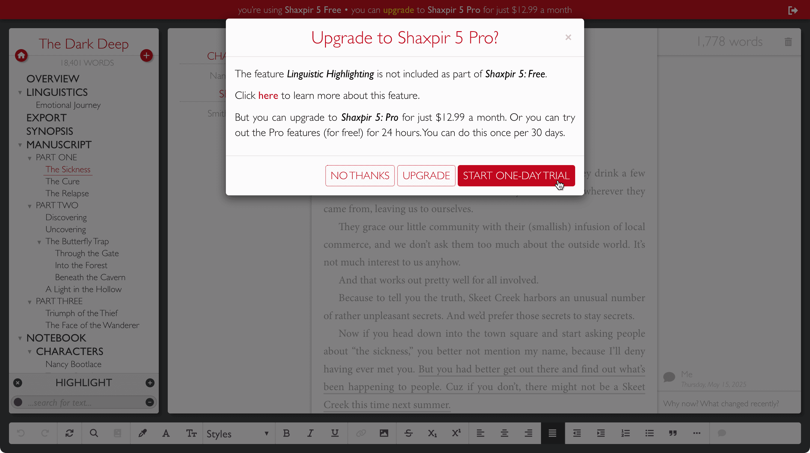 This dialog lets you know that the feature you’re trying to use is only available to Shaxpir Pro users. It gives you a quick UPGRADE button you can use if you want to become a paid subscriber. But it also gives you a button to START A ONE DAY TRIAL.