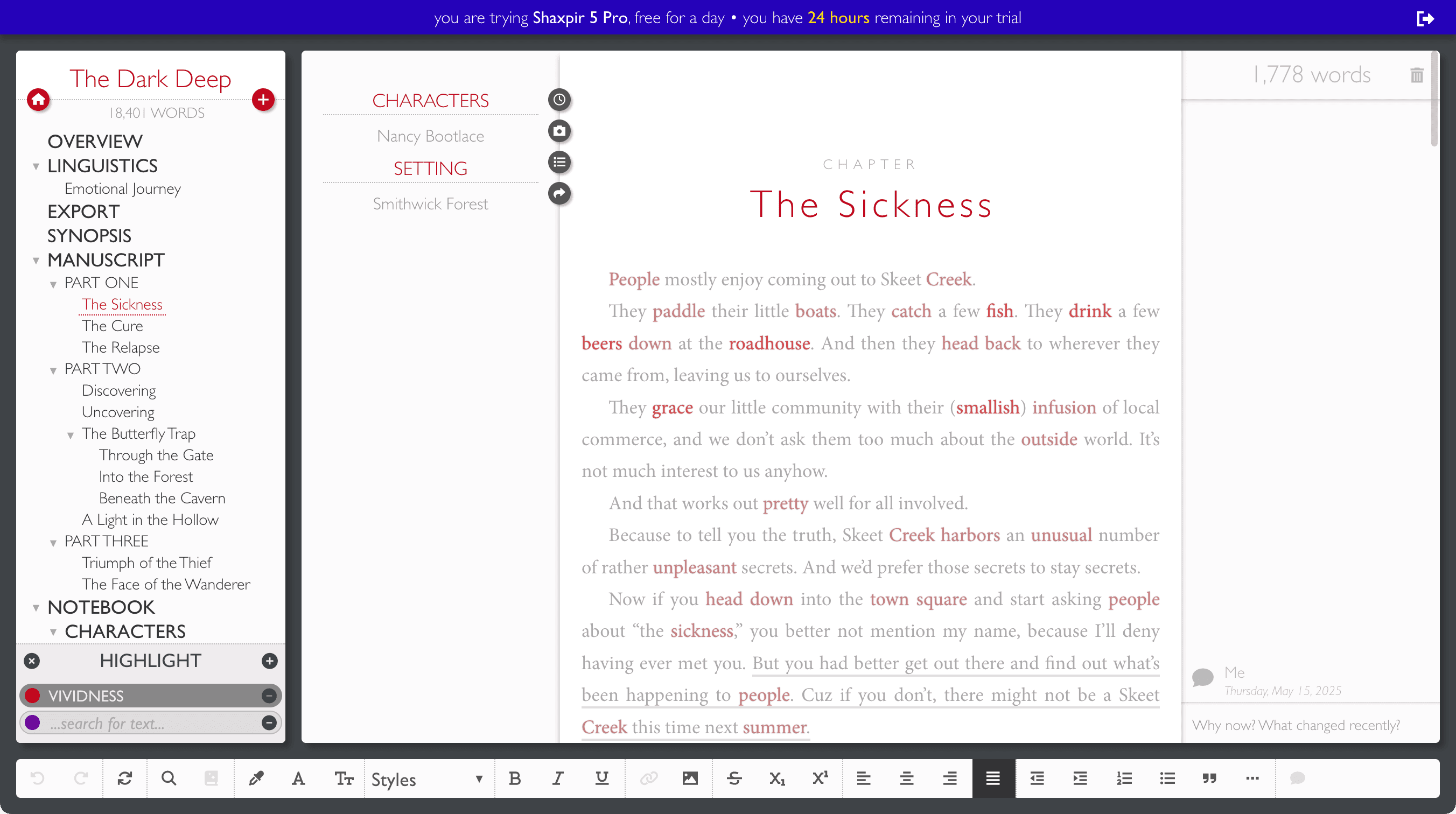 If you click on that One Day Trial button, you’ll see a new message in the application’s top-bar, saying “you are trying Shaxpir 5 Pro free for a day, you have 24 hours remaining in your trial.”