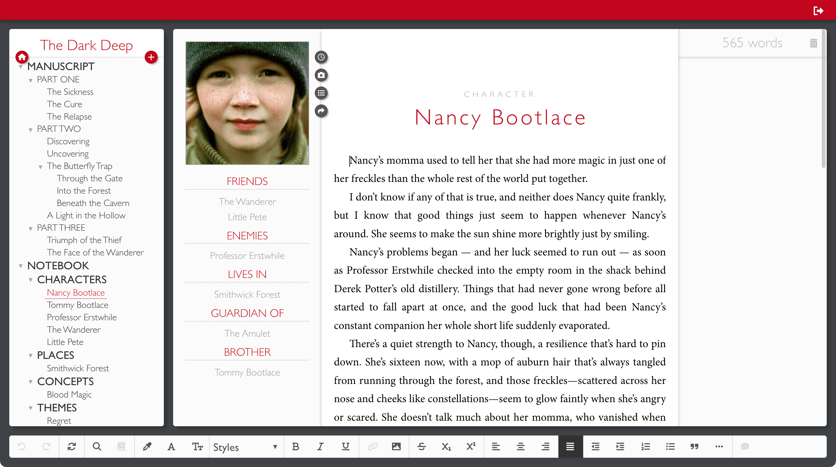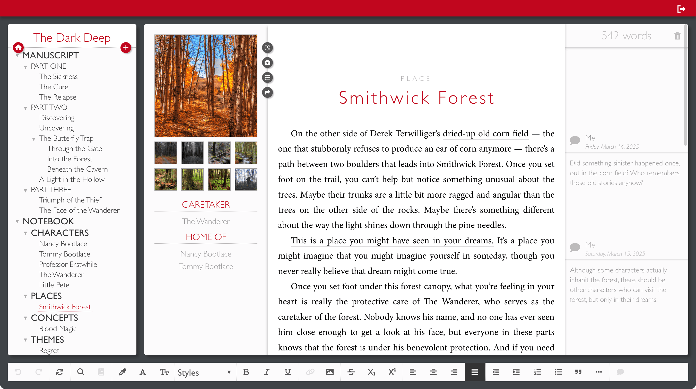 Whether you’re jotting down a few quick world-building ideas, or creating a story-bible for your seven-part epic fantasy series, it’s like having a private wikipedia for the world of your story.
